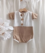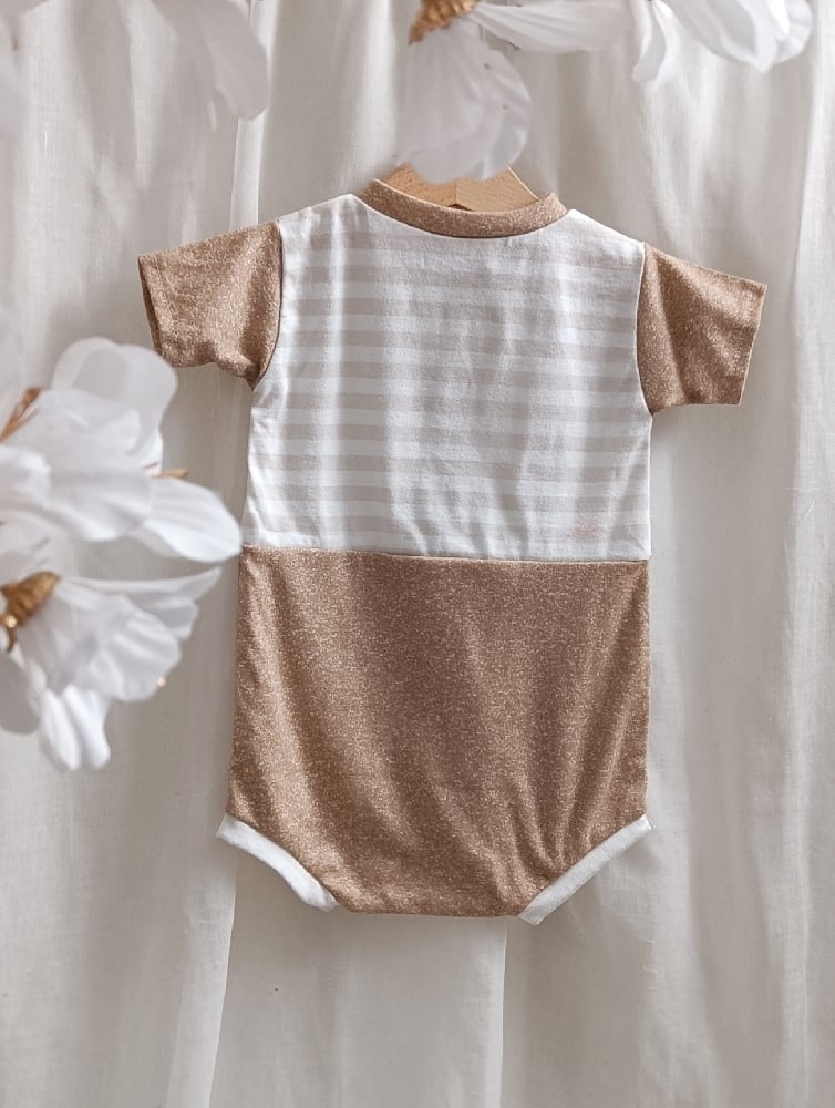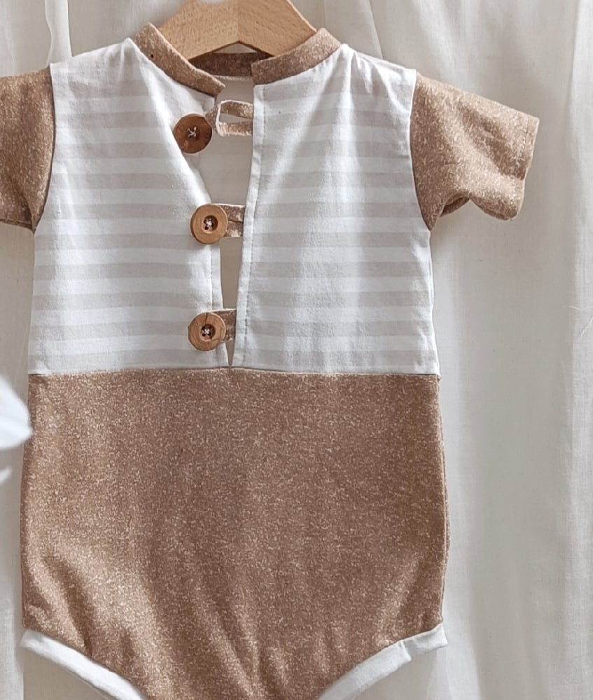 Capture charming sitter photos with our handcrafted 9–12 months boy bodysuit in beautiful beige and brown tones. Featuring a striped top and melange bottom, made of slightly elastic fabrics for comfort and flexibility. Fastened with three buttons on the front for easy changes — perfect for professional sitter photography sessions. International shipping available to France, Germany, Italy, Spain, Austria and other European countries.