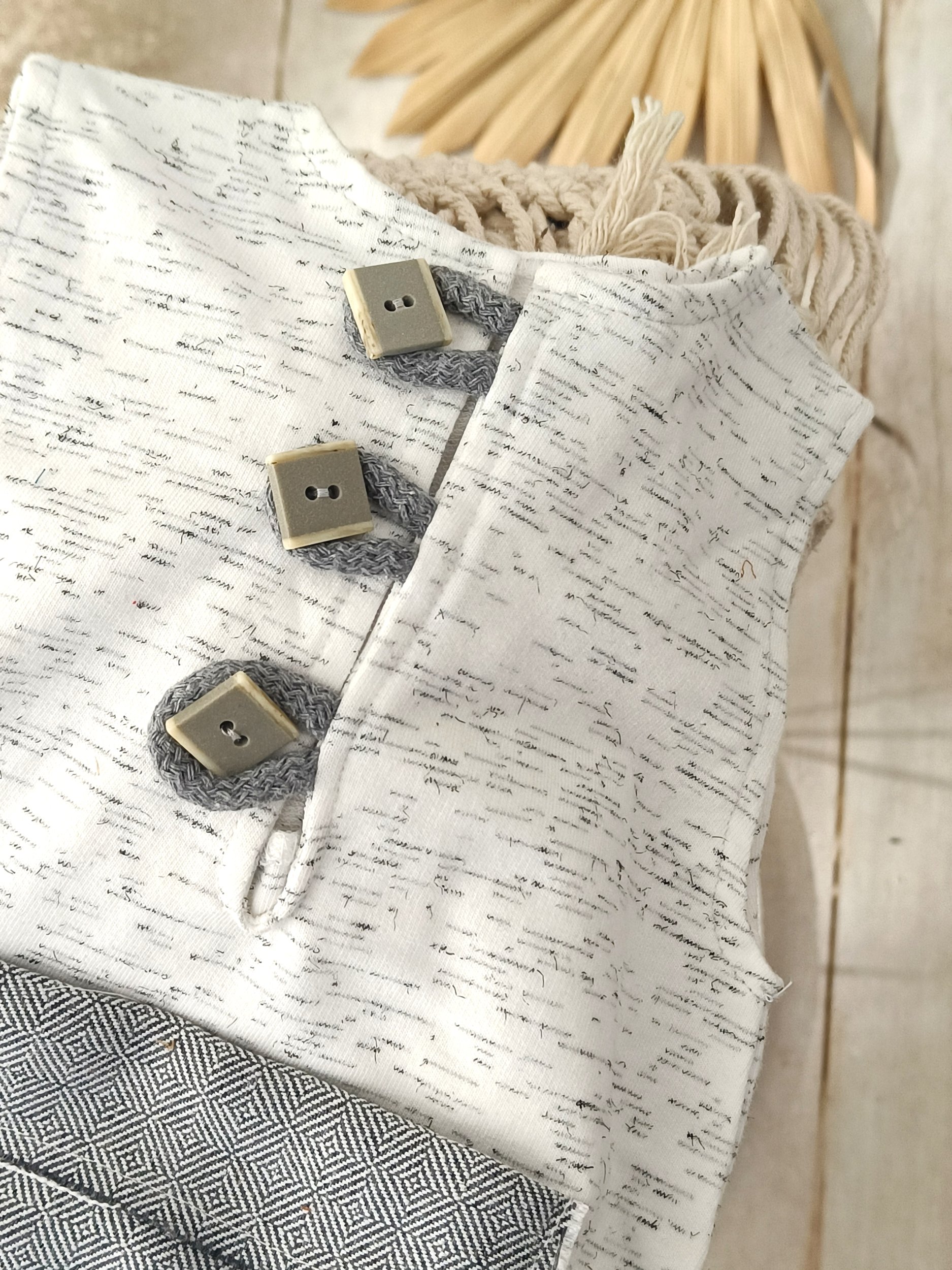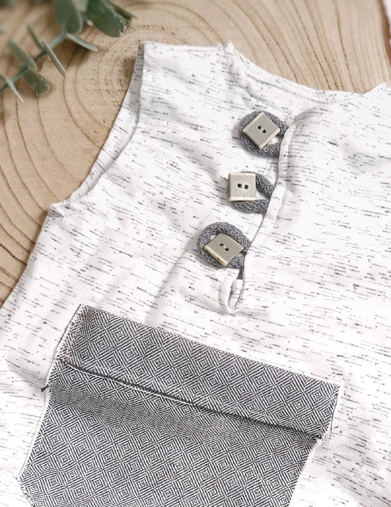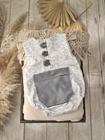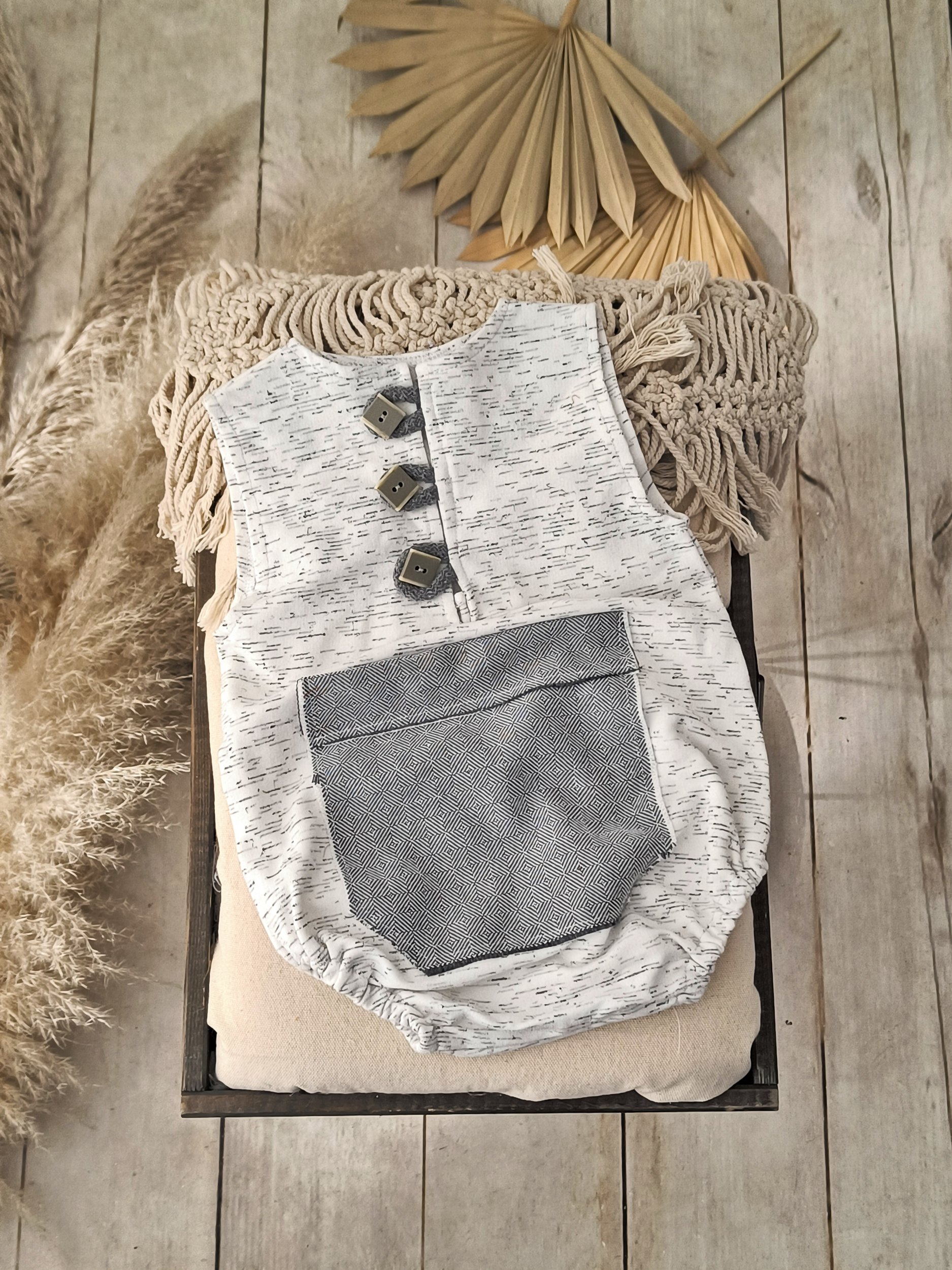 Capture adorable sitter photos with our handcrafted boy bodysuit in light grey melange. Made of soft and elastic fabric, featuring a large pocket on the front and three buttons for easy dressing. Sleeveless and comfortable — perfect for professional baby photo sessions. International shipping available to France, Germany, Italy, Spain, Austria and other European countries.