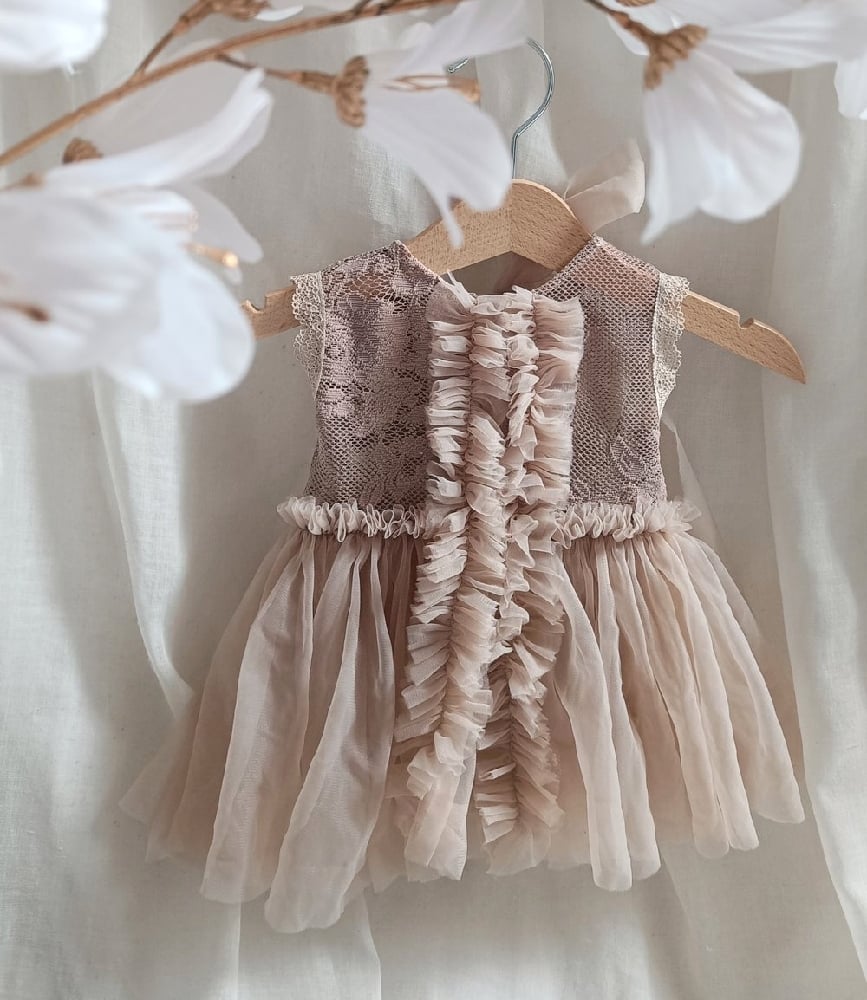Baby girl dress for photoshoots | 0-3 months | Mia | cocoa and beige | photo props