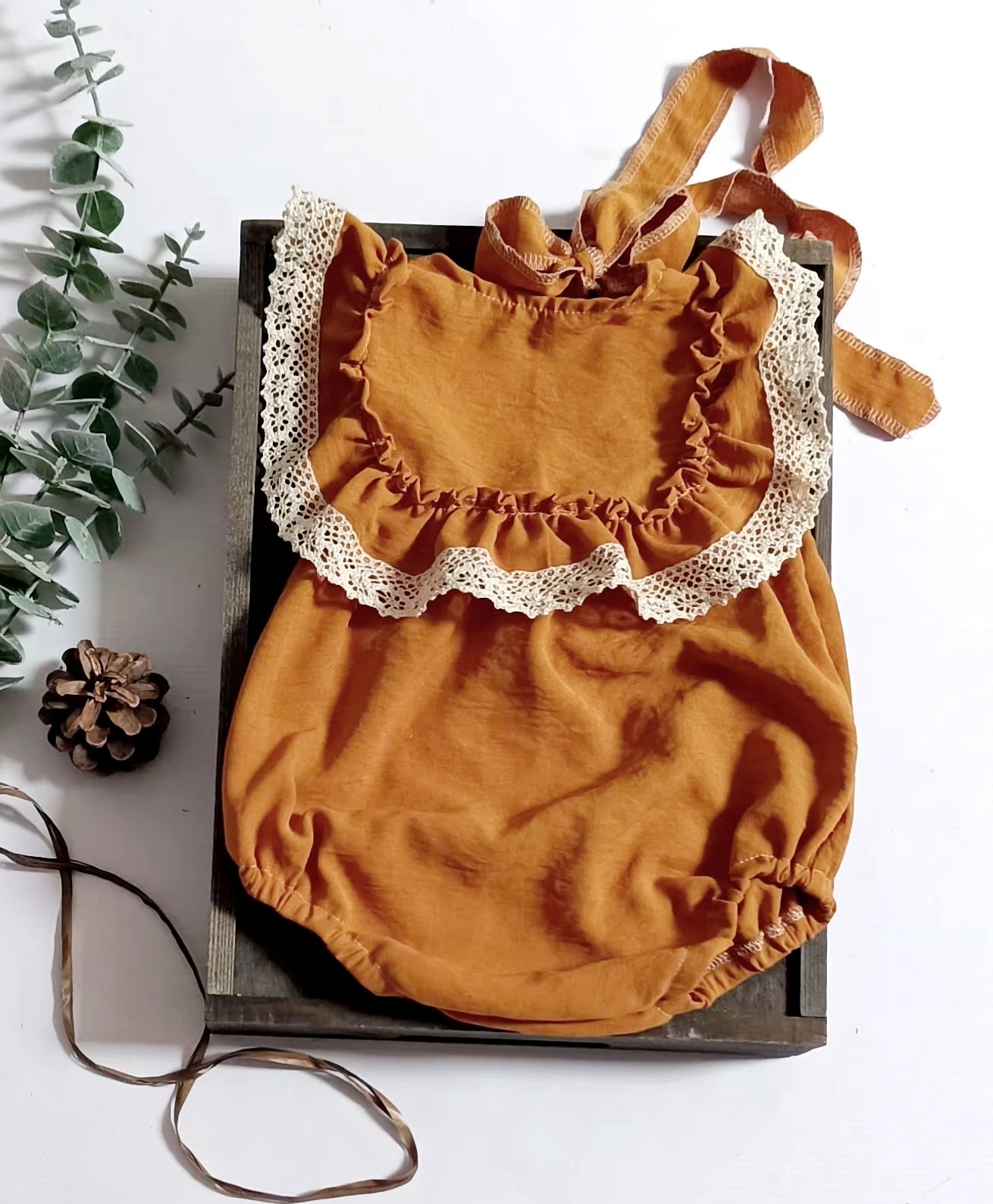 Designed with a double tie at the back, this babygrow is easy to put on and adjust, providing a secure and comfortable fit for babies aged 12 months. The elegant tie-back adds charm and practicality to your photography session.