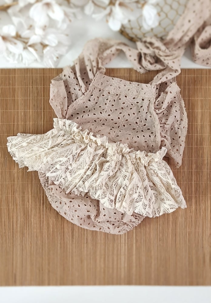 Each bodysuit is handcrafted with care, making it a unique photography prop. The combination of natural fabrics, frills, floral decorations, and adjustable tie-up design ensures memorable and beautiful sitter portraits.