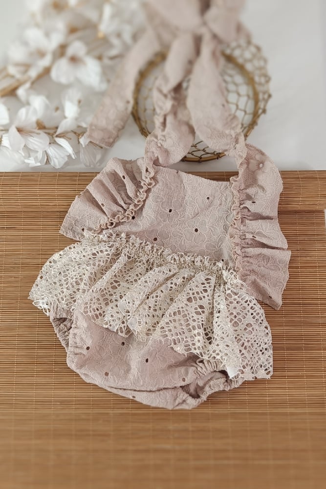 Create warm and artistic sitter portraits with our handcrafted baby girl boho body-dress. Made from soft cotton with a neutral beige floral pattern, this outfit combines natural texture with delicate elegance. The skirt is crafted from lace with a subtle golden shimmer, adding a refined bohemian glow. Ruffles made from the same floral cotton run along both sides of the yoke and extend into the neck ties. The outfit is tied at the neck for adjustable comfort and a perfect fit. Perfect as a photoprop for professional sitter photoshoots. International shipping available to France, Germany, Italy, Spain, Austria and other European countries.