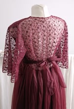 Capture stunning maternity and non-maternity photos with our handcrafted photography dress. Made of soft and elastic tulle and lace, featuring wide lace sleeves and adjustable back tie closure. Fastened in the front with three buttons and non-transparent, this dress fits sizes S, M, and small L. Perfect as a photoprop for professional photo sessions. International shipping available to France, Germany, Italy, Spain, Austria and other European countries.
