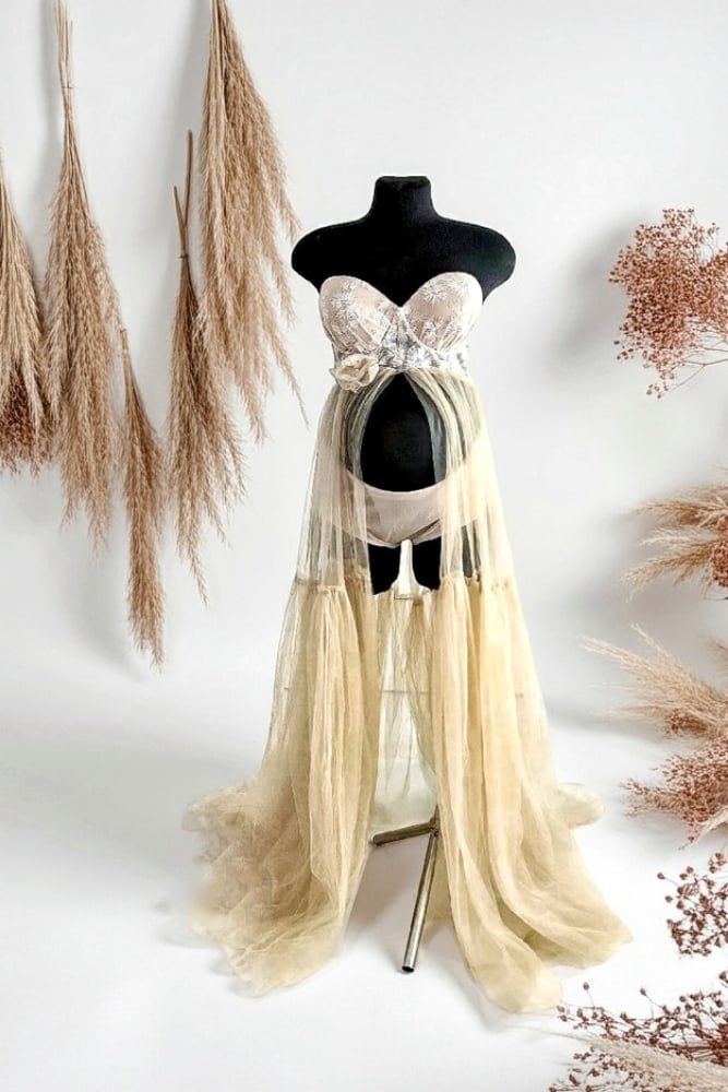 Looking for unique outfit for maternity photoshoot? Our Georgina set will be perfect for this occasion - pieces: panties, dress and decorative sleeves - stiffened cups - tied at the back - decorative tulle sleeves - elastic panties - color: champagne - fits for sizes: S, M - Handmade photoshoot set SHIPPING: - Ready to ship - shipment within 24-48h #tumtitum #tumtitumpgotoprops #maternityprops #photoprops #maternitydress #maternitygown #tullegown
