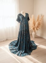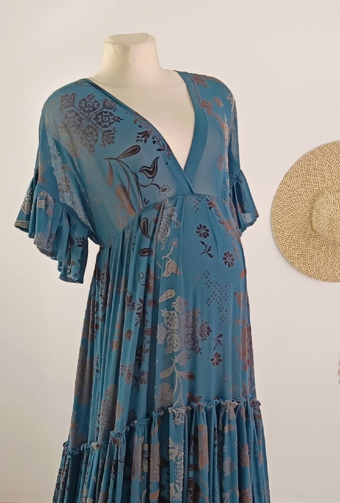 The gown features sleeves finished with frills, giving it a romantic boho character. Its flowing design makes it ideal for artistic and natural maternity photography.