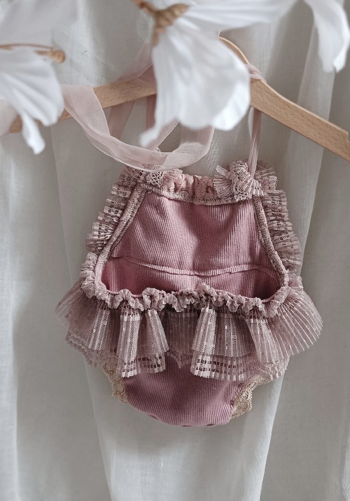 The babygrow features a dusty pink shade — soft, feminine, and timeless. This elegant tone beautifully complements neutral setups, floral props, and boho-inspired photography themes.