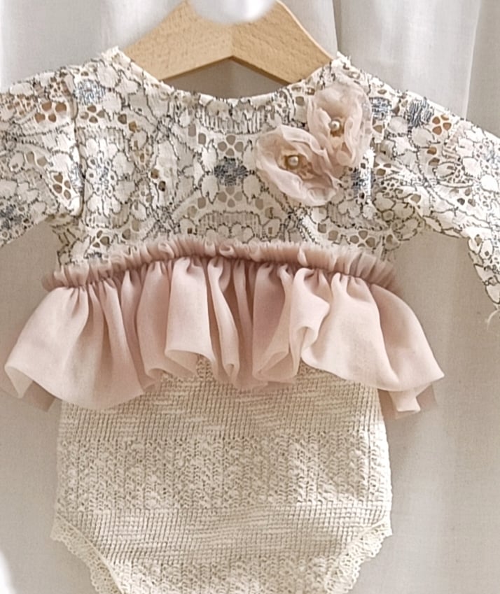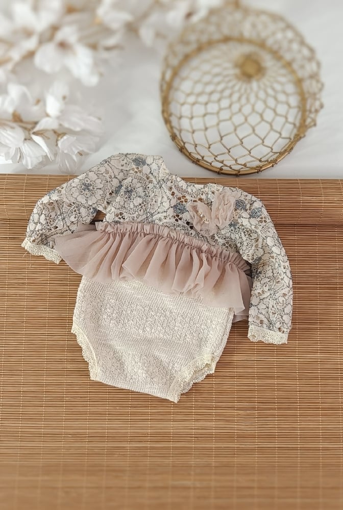 The bodysuit is decorated with soft frills, adding a charming, delicate touch to every photo. The frilled details make each portrait look timeless and sweet.