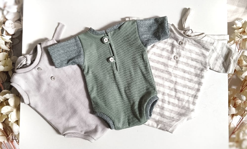 Capture adorable newborn boy portraits with this special set of three handcrafted bodysuits, offered at a wonderful price. Each piece is made of soft, elastic fabrics and designed for maximum comfort, easy dressing, and beautiful photo results. Perfect for photographers looking to expand their newborn wardrobe with versatile, timeless outfits.