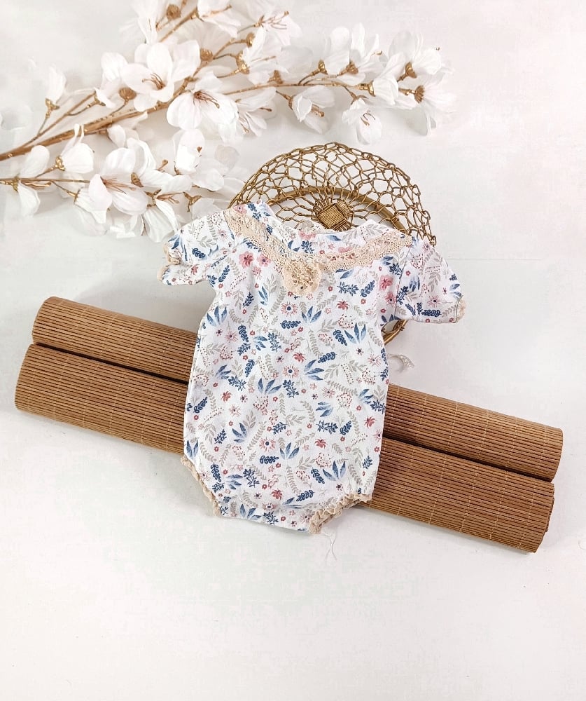 Capture the delicate beauty of your little models with our handcrafted Newborn Girl Bodysuit. Featuring a charming floral pattern in soft blue and pink, this bodysuit combines comfort, elegance, and practicality. Designed with an open back tied for easy outfit changes, slightly elastic fabric, and delicate lace accents, it is perfect for professional newborn photography sessions. International shipping available to France, Germany, Italy, Spain, Austria, and other European countries.