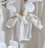 The bodysuit features puffy sleeves for a sweet and timeless look, along with tiny floral decorations in the front that add a delicate, handmade charm. Every detail is designed to make each portrait graceful and heartwarming.