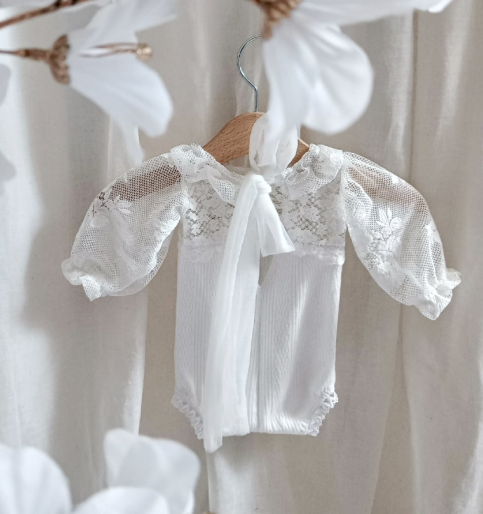 Bring soft elegance to your newborn photoshoot with our handcrafted Newborn Bodysuit in Off White. Made of elastic and soft fabric combined with delicate lace, this outfit is both comfortable and refined. Featuring charming puffy sleeves and little flowers in the front, it adds a romantic touch to every photo. Designed with an open back tied for easy changes – perfect for natural and timeless newborn photography. International shipping available to France, Germany, Italy, Spain, Austria, and other European countries.