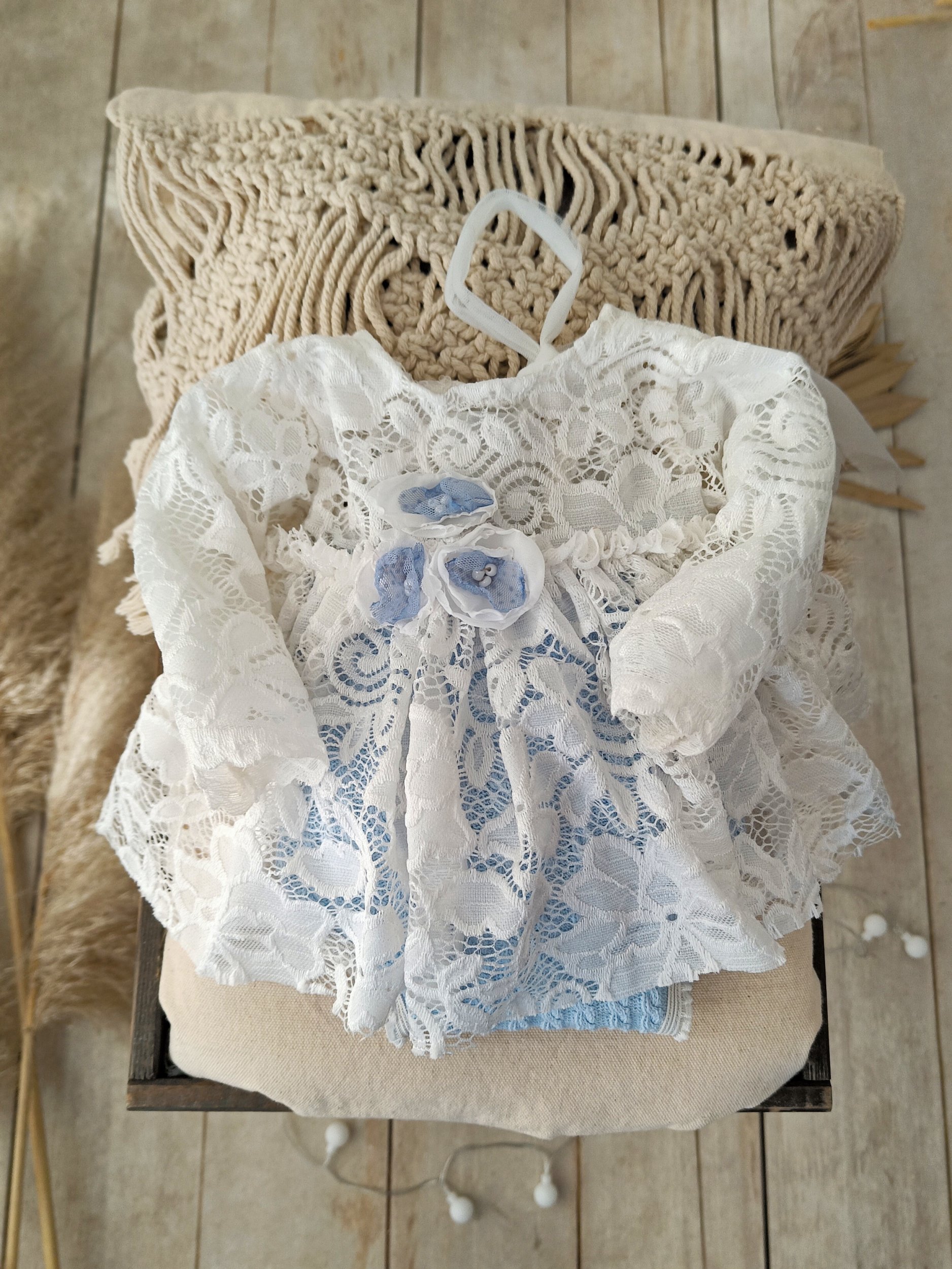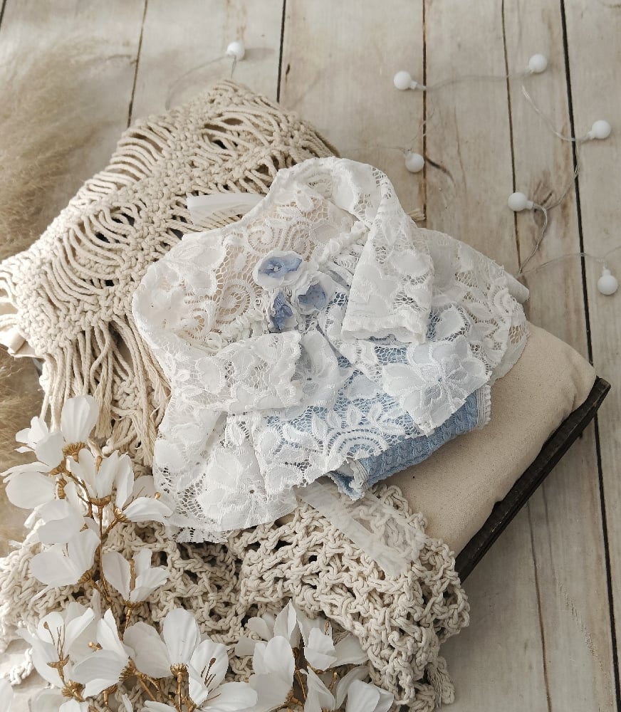 This newborn dress is handmade with care, combining soft blue knit with delicate off-white lace details. The gentle color palette creates a timeless, airy look perfect for both studio and natural light newborn photography sessions.