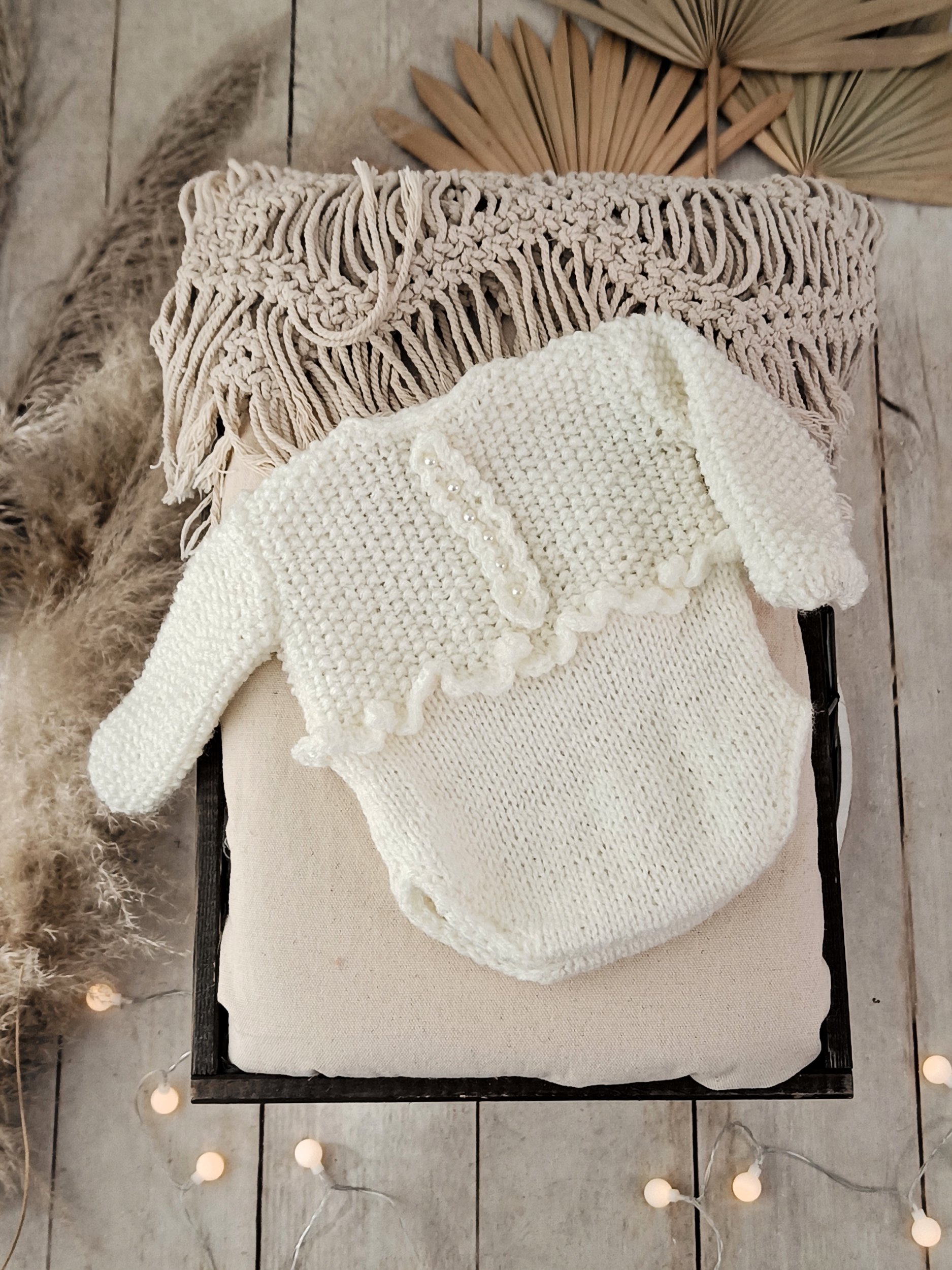 This beautiful bodysuit is handmade in newborn size from soft wool, offering warmth, stretch, and cozy comfort. Its simple silhouette and premium yarn make it ideal for posing and wrapping during newborn sessions.