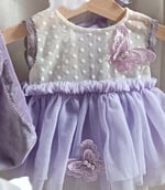 The pastel dress features an airy, elegant design with pastel purple and cream tones. The color combination creates a subtle and timeless look, ideal for soft and dreamy newborn portraits.