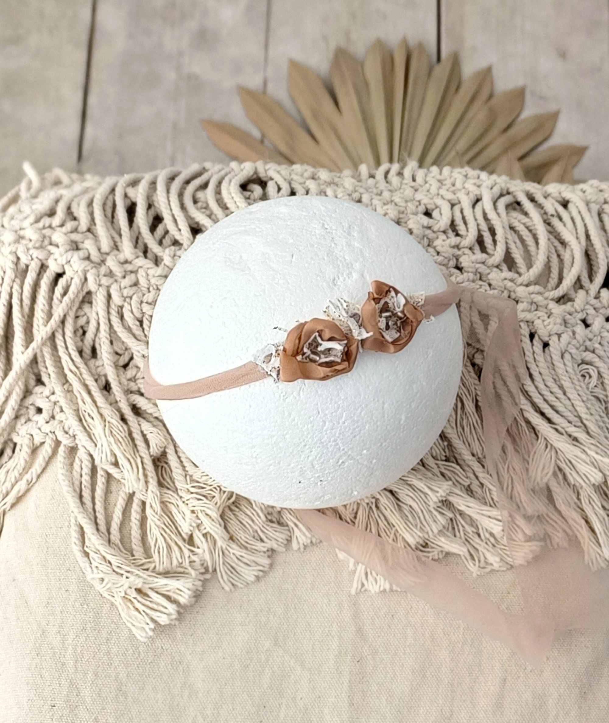 This handcrafted newborn headband is designed for photography sessions, featuring a soft adjustable band decorated with two small rustic brown flowers. It is the perfect accessory for natural, earthy and boho-inspired newborn styling.