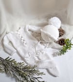 The set includes a matching knitted hat finished with a soft pompom. This sweet detail adds character and charm, perfectly complementing the onesie for a complete newborn outfit ready for the camera.