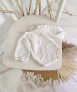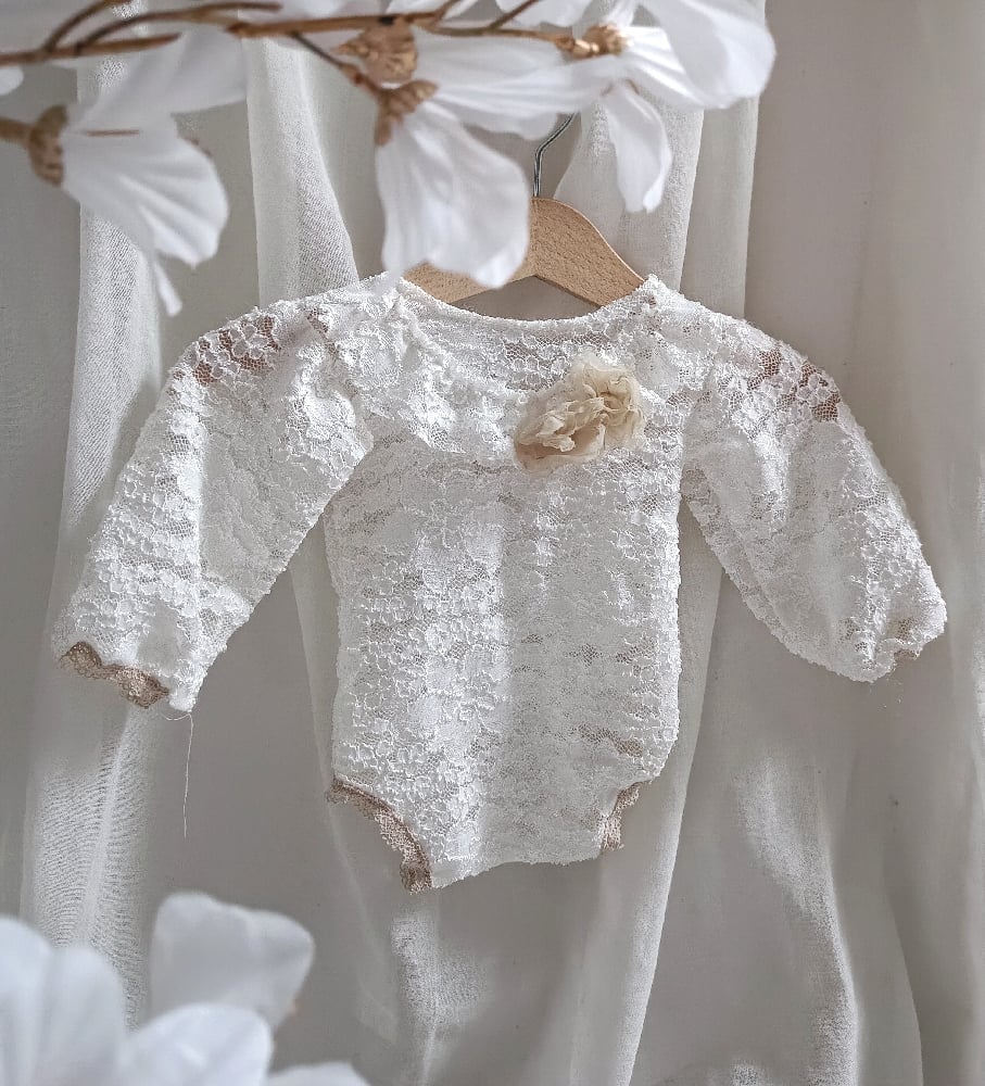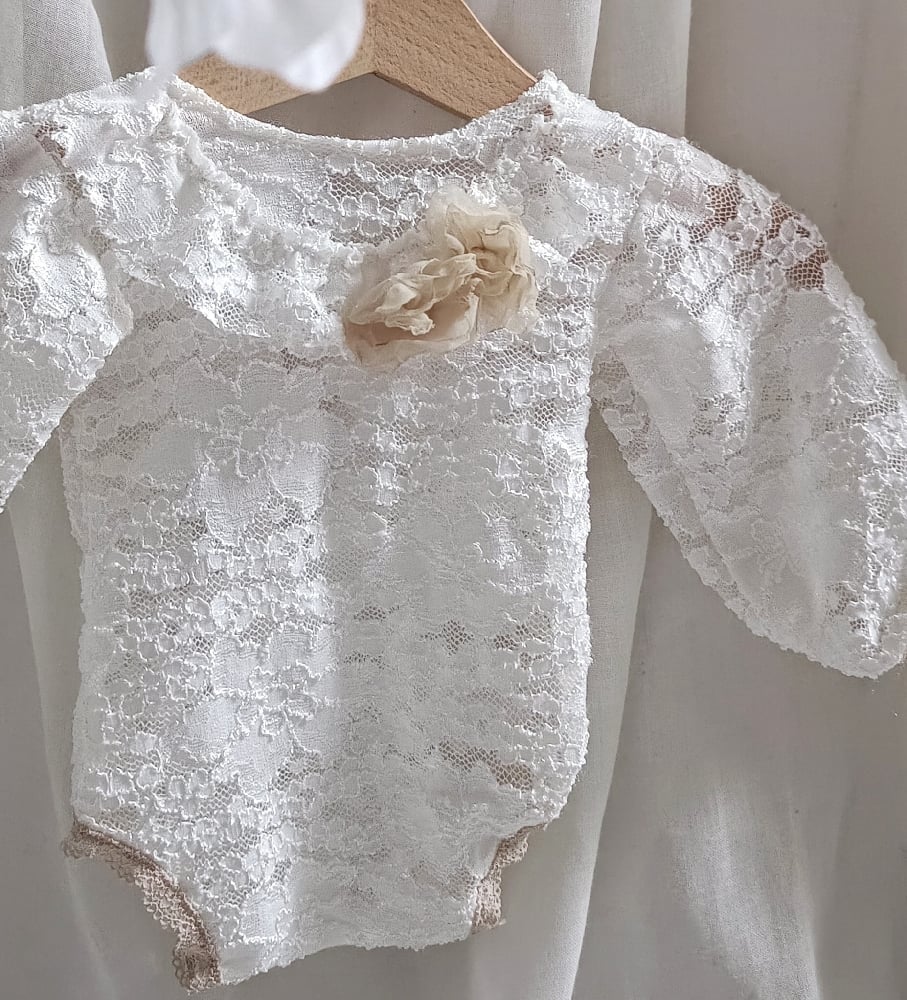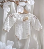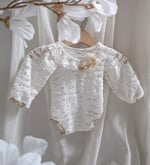 With this handcrafted white lace bodysuit, every photo radiates softness, innocence, and timeless beauty. Designed for comfort, elegance, and natural style — perfect for professional newborn photography sessions.