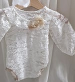 Each bodysuit is handmade with care from high-quality lace fabric. Its combination of elastic material, open-back design, and wide decorative sleeves makes it a beautiful photography prop for creating elegant, natural newborn portraits.