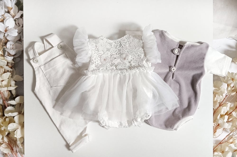 The second outfit is a delicate body-dress featuring a lace top, a light tulle skirt, and hand-decorated flowers on the front. The back is open and tied, allowing easy dressing and adding an elegant, airy touch to newborn girl portraits.