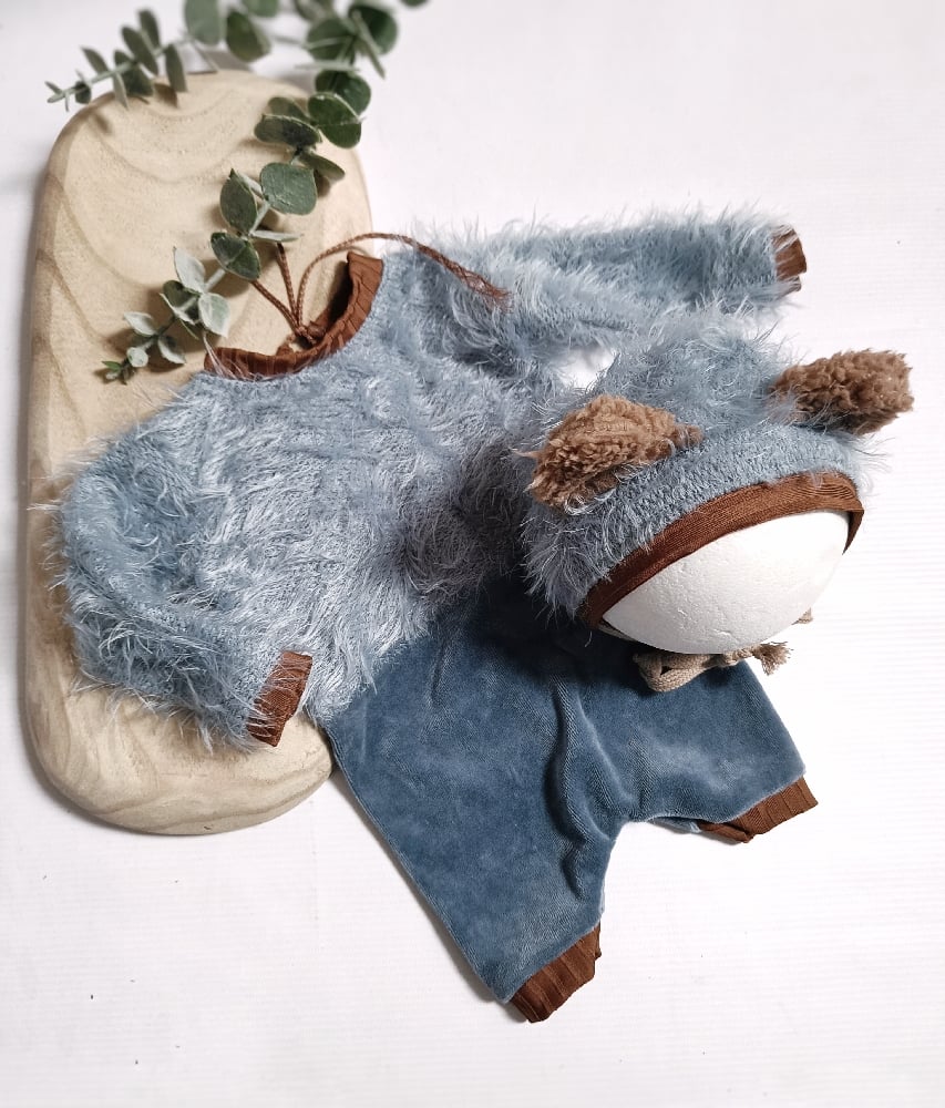 The delicate dusty blue tone is beautifully complemented by brown cuffs on the sleeves and legs, perfectly matched with the brown bear ears on the bonnet. This harmonious color palette adds warmth and charm to every newborn setup.