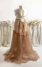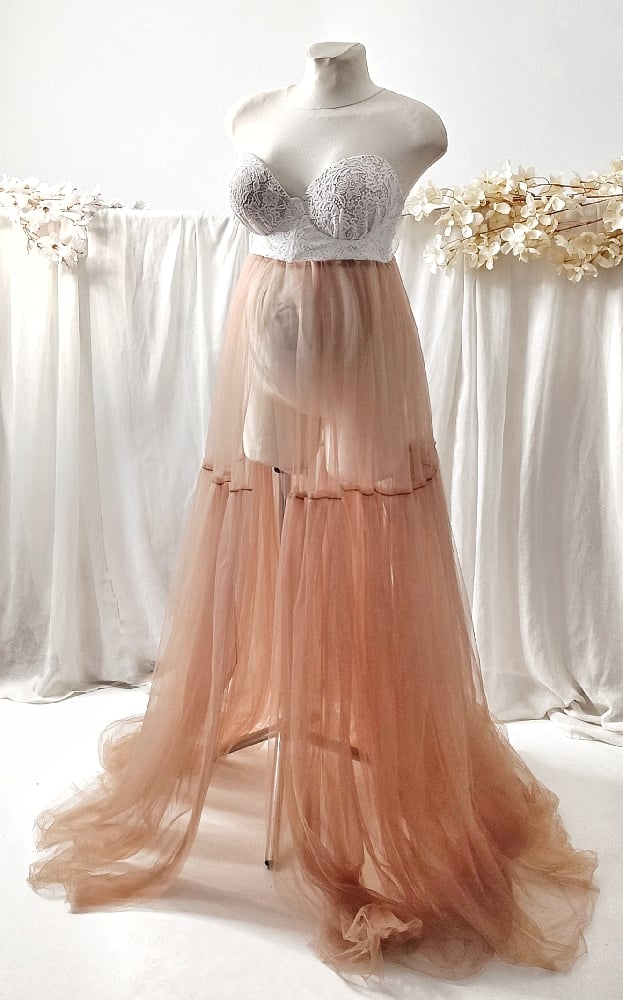 Capture stunning maternity photos with our handcrafted photoshoot set. Includes a dress, panties, and decorative removable tulle sleeves. Features stiffened cups and tie closure at the back, with elastic panties for comfort. Available in camel and ecru, size M. Perfect as a photoprop for maternity sessions. International shipping available to France, Germany, Italy, Spain, Austria and other European countries.