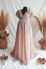 This gown is made of elegant lace with a non-transparent lining, providing comfort, elegance, and modesty. The decorative flowers add a charming and sophisticated touch to each portrait.