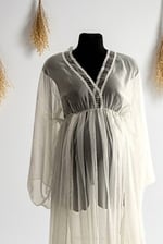 This chiffon dress Eliana is perfect for maternity/non maternity photo session FEATURES - made of chiffon - top finished with decorative lace - elastic band under the top - wide decorative sleeves - open for one leg - colour: cream - Handmade photography dress SHIPPING • Ready to ship - shipping within 24-48h Check the REVIEWS from our customers on the bottom of the site! TAGS: accessoires photo | Foto-Requisiten | accesorios para fotografiá • Tulle dress • Tüllkleid • robe en tulle • robe pour la séance • fotoshooting