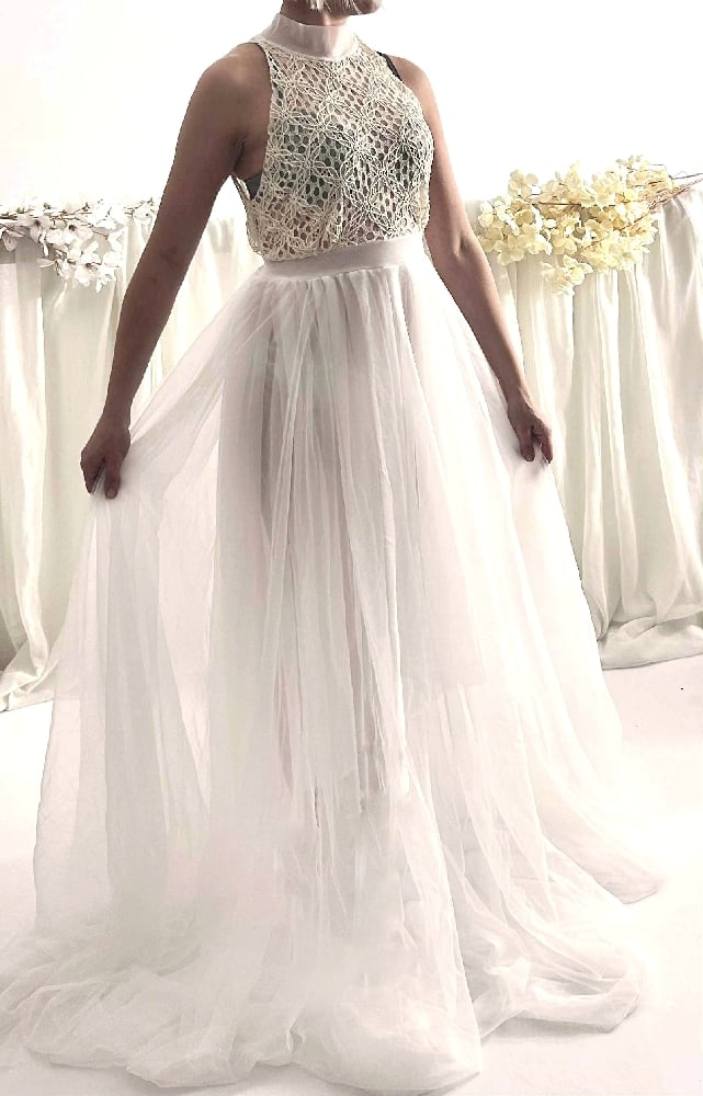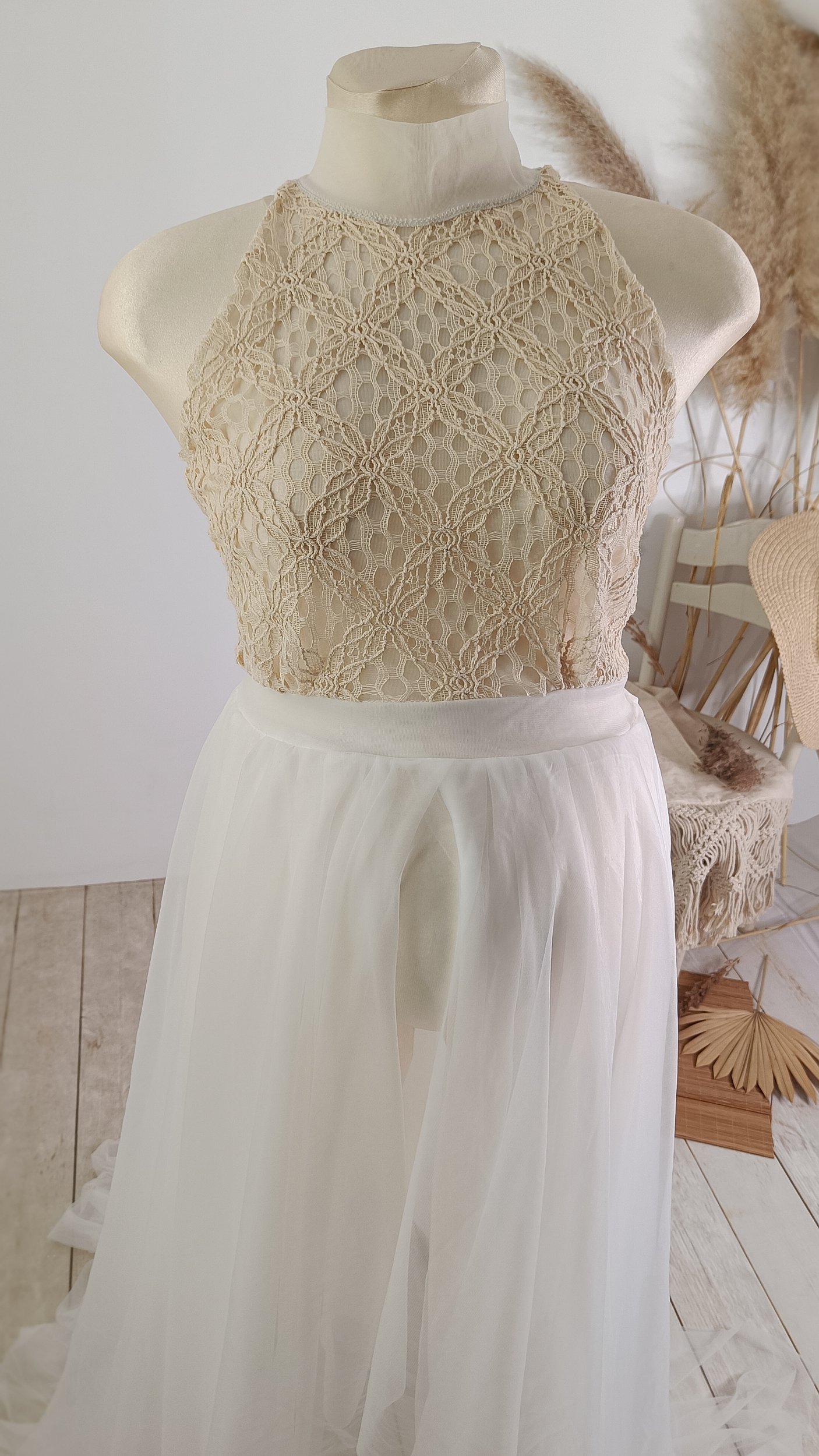 Capture stunning maternity photos with our handmade maternity dress. Made of delicate tulle and lace in ecru and beige colors, tied at the neck and back for an adjustable fit. Suitable for sizes S, M, and small L. Perfect for professional maternity photoshoots. International shipping available to France, Germany, Italy, Spain, Austria and other European countries.