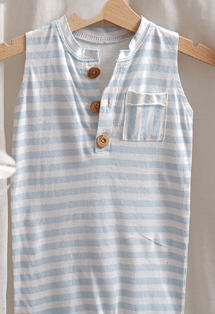 Capture adorable sitter photos with our handcrafted boy onesie in light blue stripes. Made of soft and elastic fabric, sleeveless and fastened with three buttons in the front for easy dressing. Comfortable, stylish, and perfect for professional baby photo sessions. International shipping available to France, Germany, Italy, Spain, Austria and other European countries.