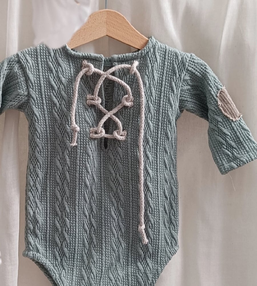 Capture adorable sitter photos with our handcrafted 12-months boy bodysuit in sage. Made of super elastic sweater fabric, featuring decorative front tie and elbow patches for a charming touch. Comfortable, stylish, and perfect for professional sitter photo sessions. International shipping available to France, Germany, Italy, Spain, Austria and other European countries.