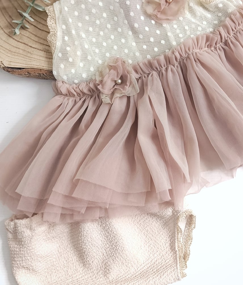 Capture adorable sitter photos with our handcrafted photography set in old rose and cream tones. Made of soft and elastic fabrics, featuring a fully open dress double-tied at the back for easy dressing and comfort, with matching panties included. Perfect for professional sitter photo sessions. International shipping available to France, Germany, Italy, Spain, Austria and other European countries.