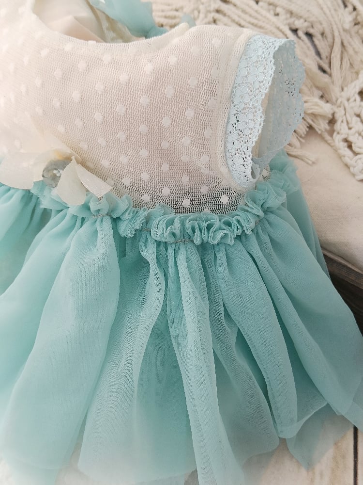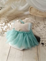 Capture adorable sitter photos with our handcrafted photography set in turquoise and off-white tones. Made of soft and elastic fabrics, featuring a fully open dress double-tied at the back for easy dressing and comfort, with matching panties included. Perfect for professional sitter photo sessions. International shipping available to France, Germany, Italy, Spain, Austria and other European countries.