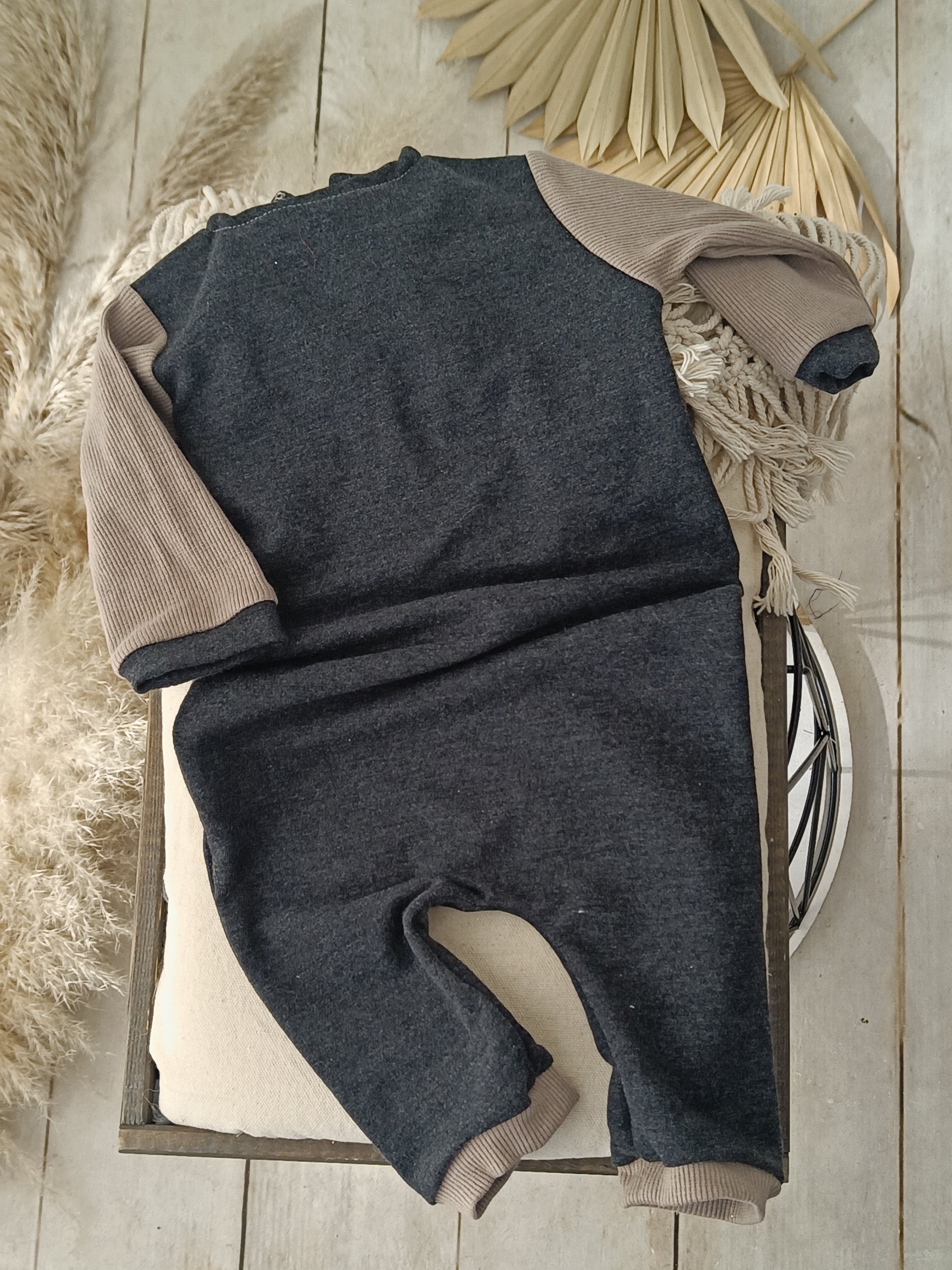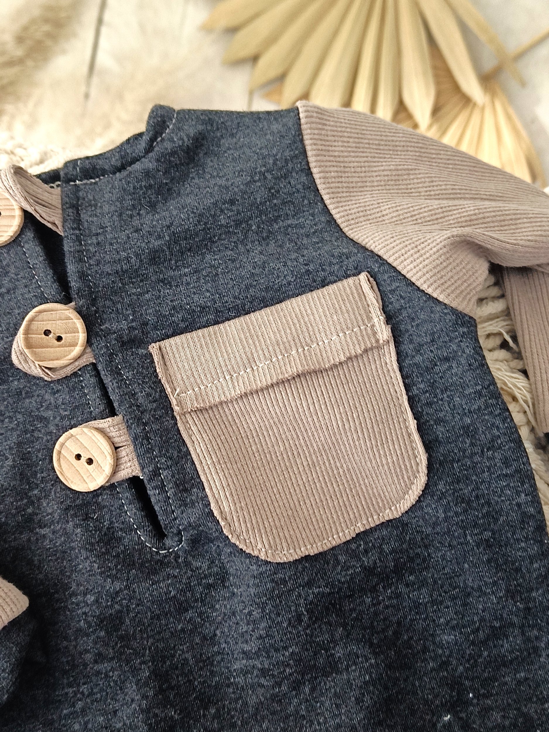 Capture adorable sitter photos with our handcrafted 9–12 months boy onesie in graphite with beige ribbed pocket and details. Made of soft, slightly elastic fabrics for maximum comfort, featuring long sleeves and a front closure with three buttons for easy dressing. Perfect for professional sitter photo sessions. International shipping available to France, Germany, Italy, Spain, Austria and other European countries.