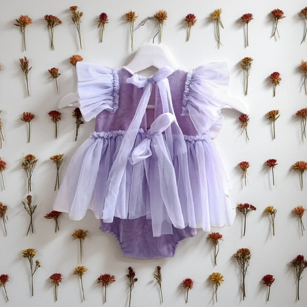 Capture enchanting photos with our handcrafted 12-months girl body-dress. Made of soft and elastic velour and tulle, featuring double tie closure at the back for easy dressing, adorned with many tulle frills and delicate butterfly decorations. Perfect for little princess photoshoots. International shipping available to France, Germany, Italy, Spain, Austria and other European countries.
