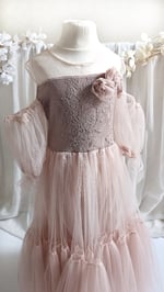 <p>This dress is made of <strong>soft tulle</strong> in a delicate powder pink color, creating a dreamy and elegant look. The lightweight material ensures comfort and freedom of movement during every photoshoot.</p>