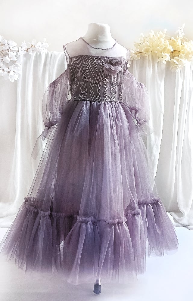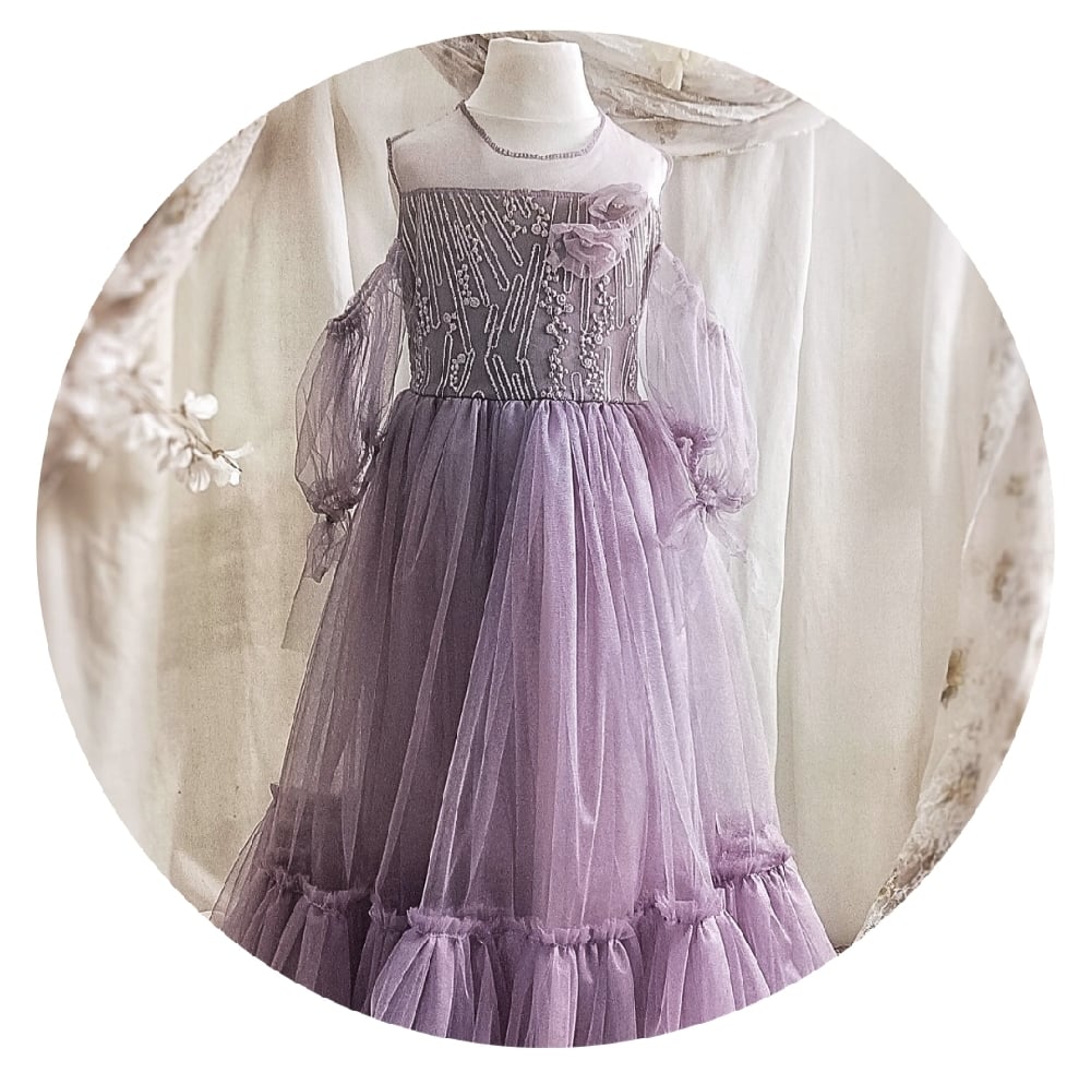 This dress is made of soft tulle in a dusty purple color, creating a dreamy and elegant look. The lightweight material ensures comfort and freedom of movement during every photoshoot.
